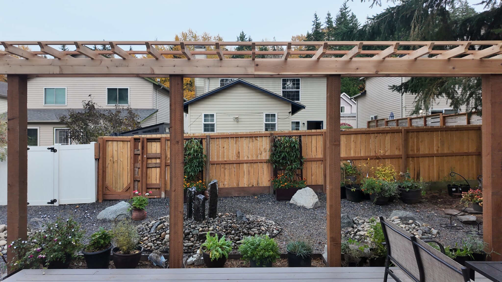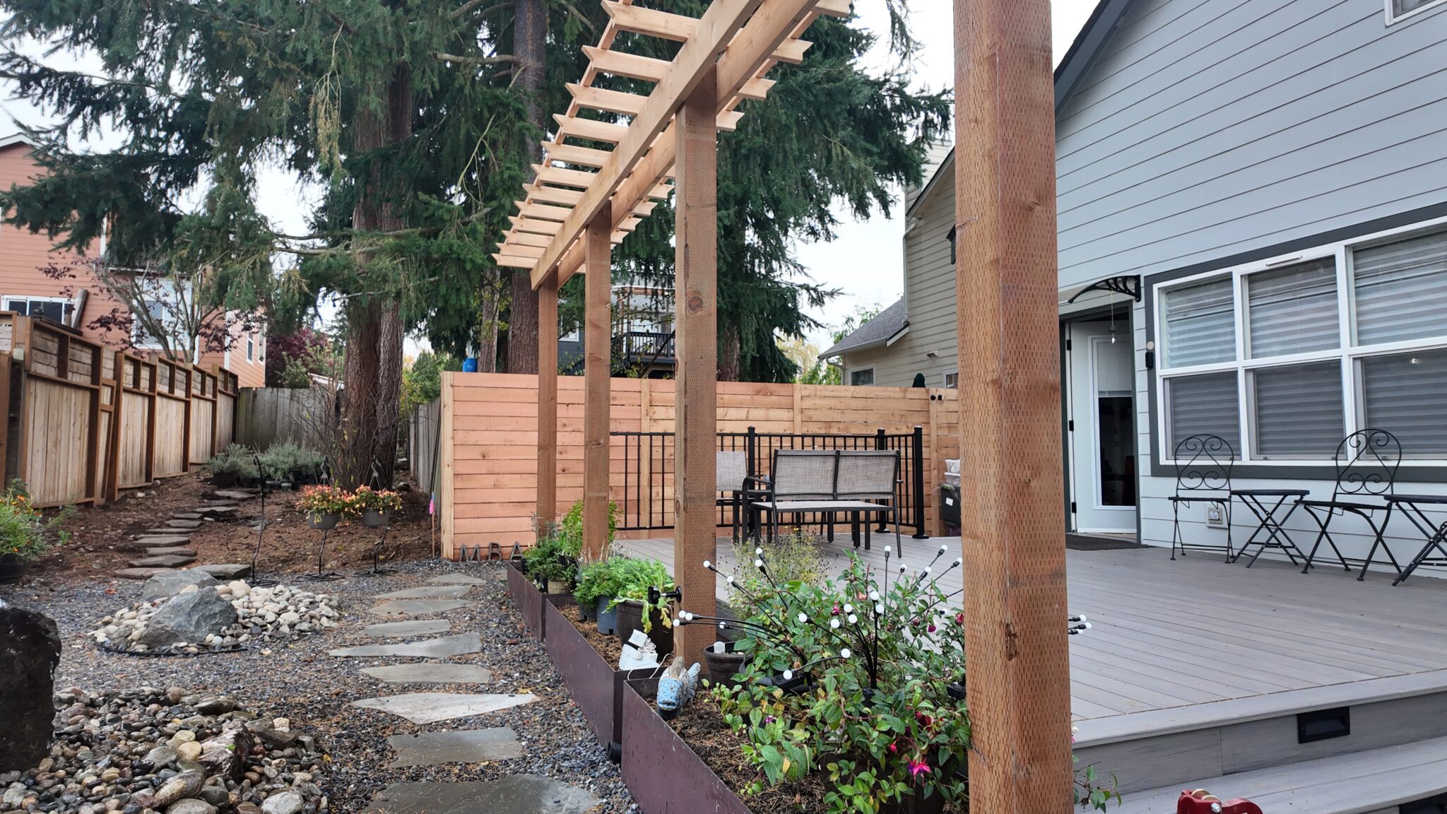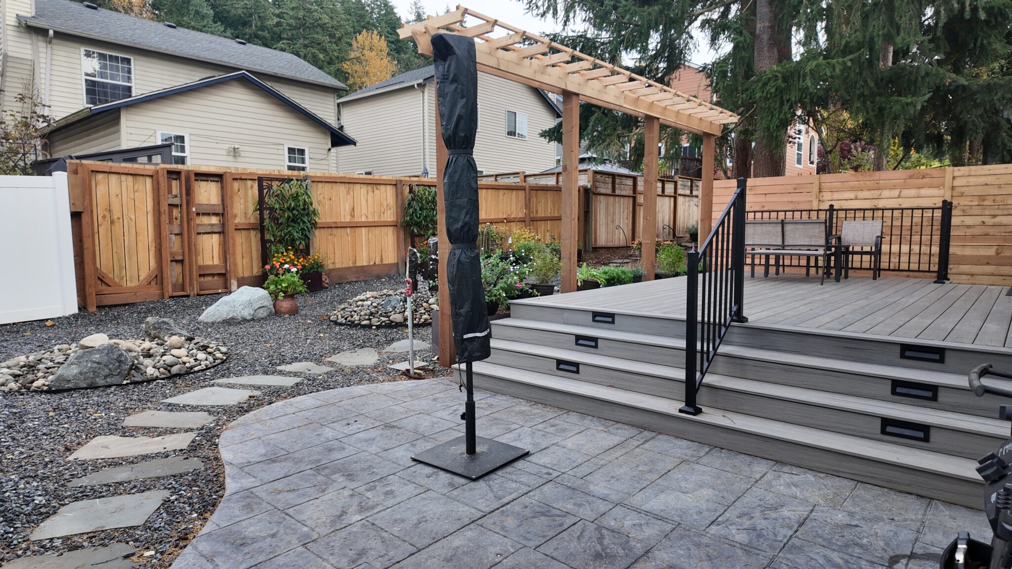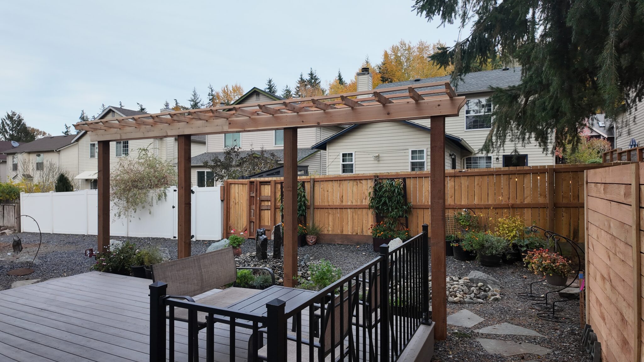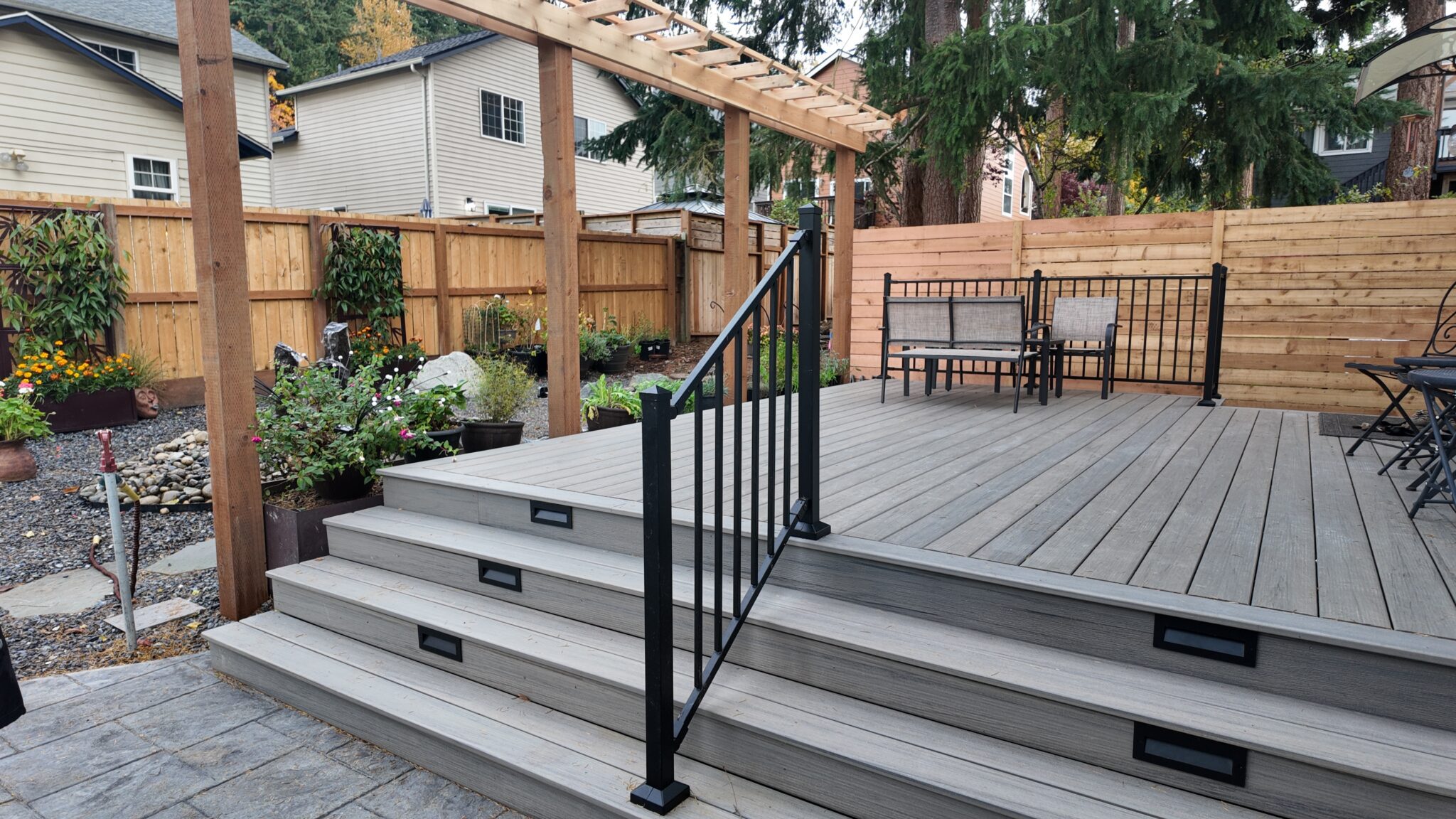 The PCL team removed the existing concrete and wood decking and rebuilt the space with a composite deck featuring modern black railings and built-in lighting. A custom cedar pergola defines the seating area while adding structure and warmth. The surrounding landscape includes a natural stone walkway, decorative gravel beds, and a basalt column water feature for a calm focal point.
