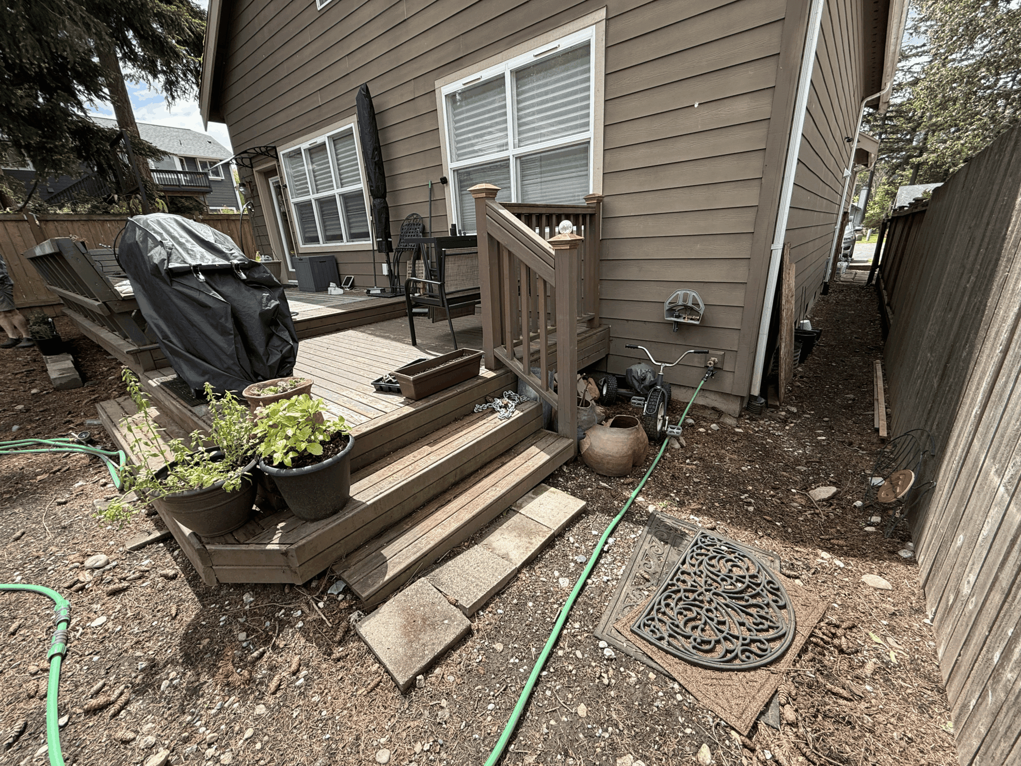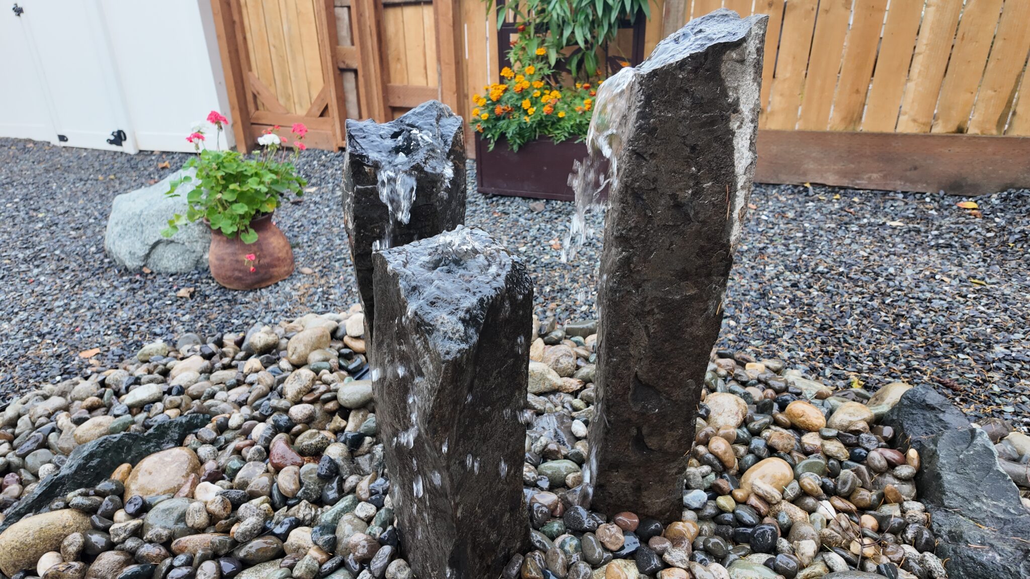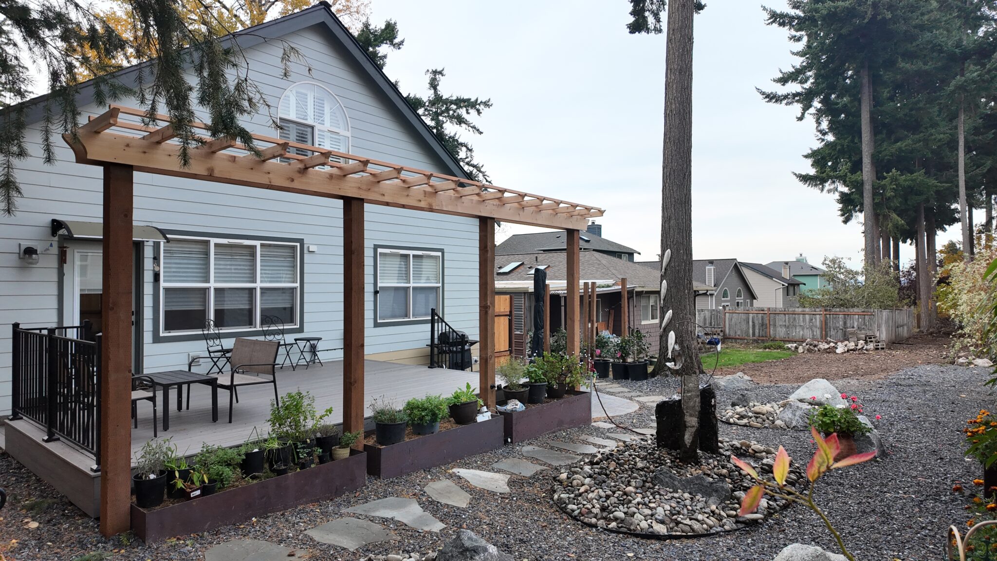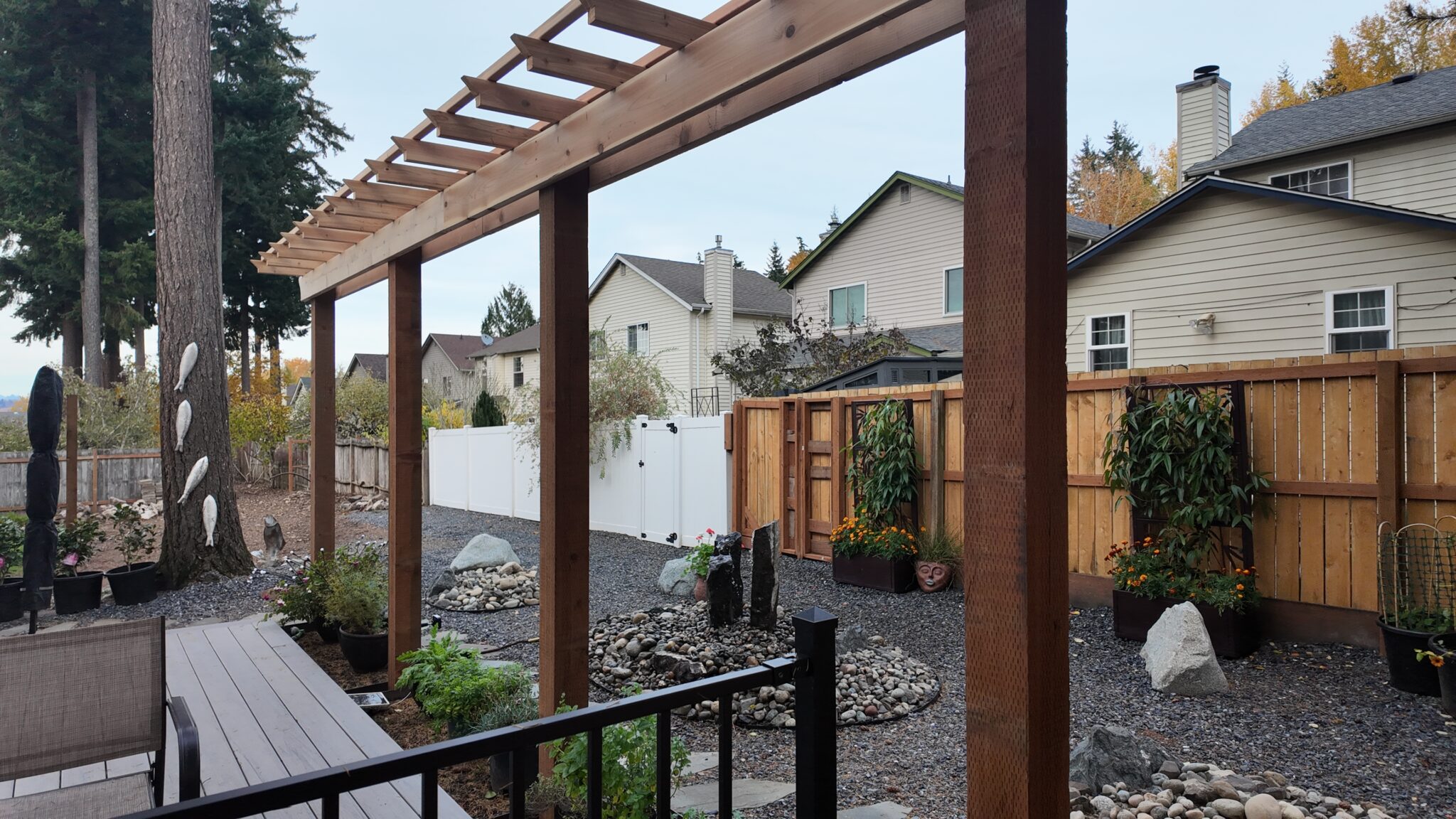 The PCL team removed the existing concrete and wood decking and rebuilt the space with a composite deck featuring modern black railings and built-in lighting. A custom cedar pergola defines the seating area while adding structure and warmth. The surrounding landscape includes a natural stone walkway, decorative gravel beds, and a basalt column water feature for a calm focal point.