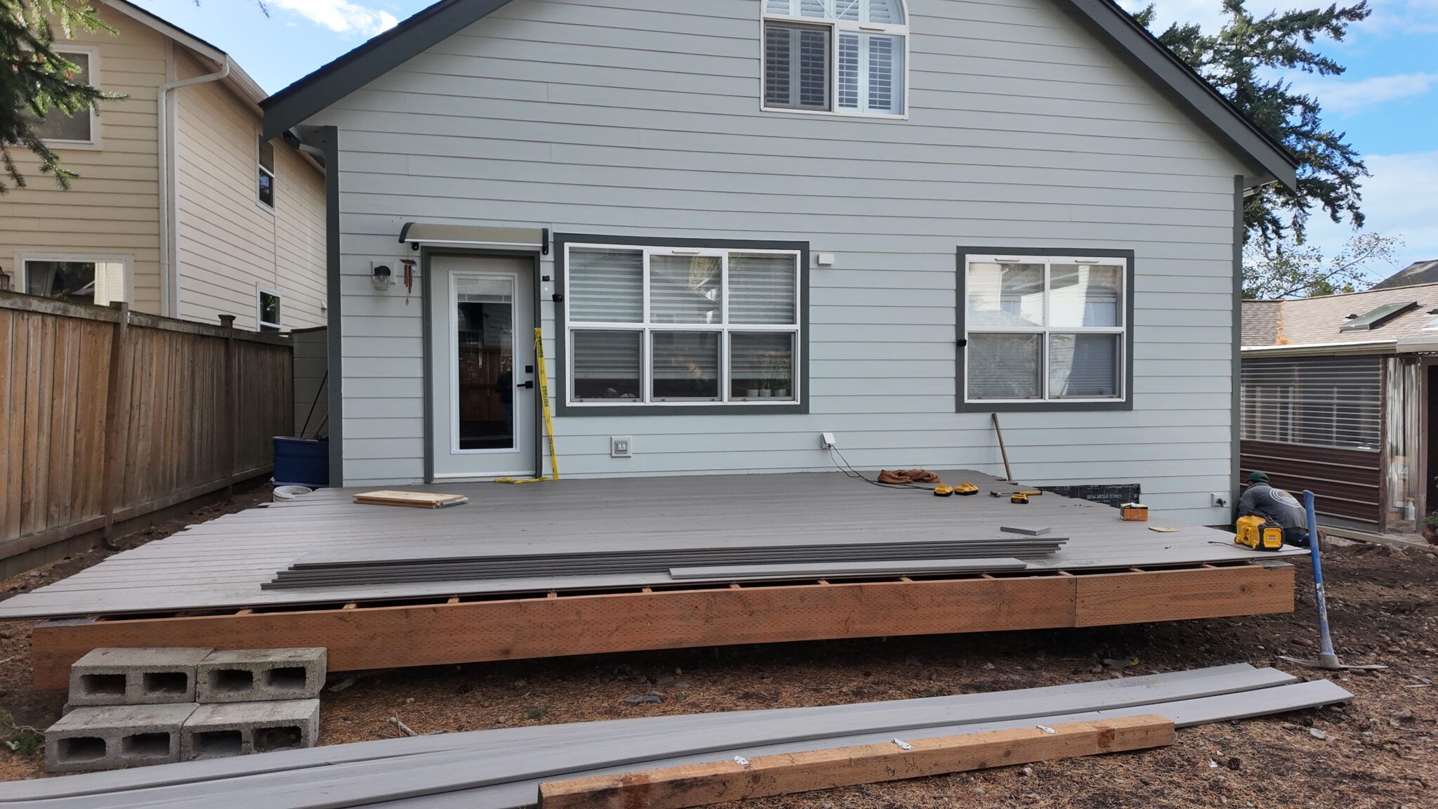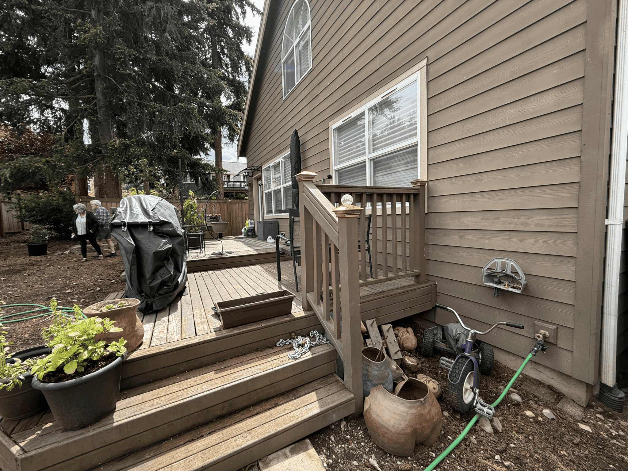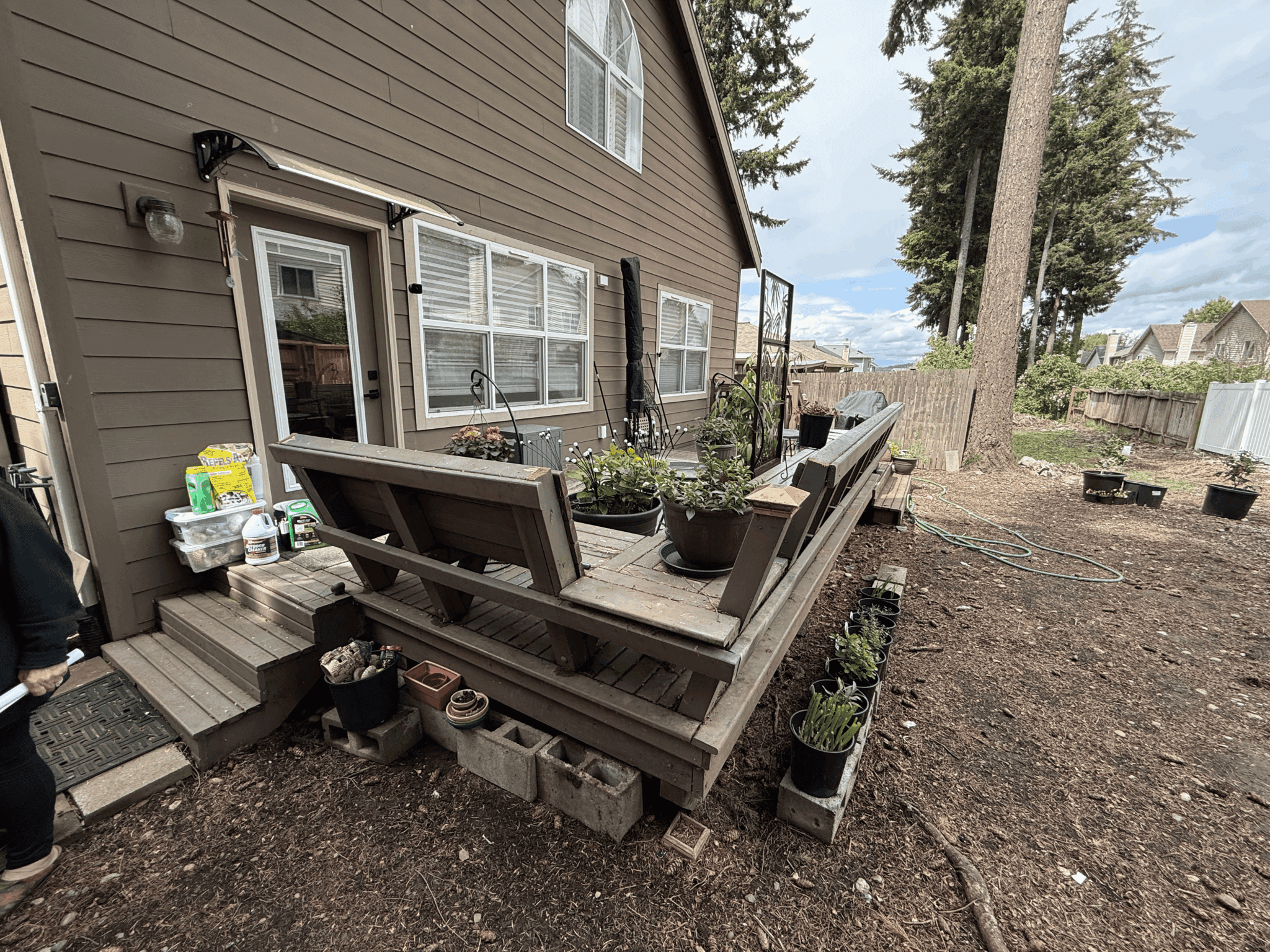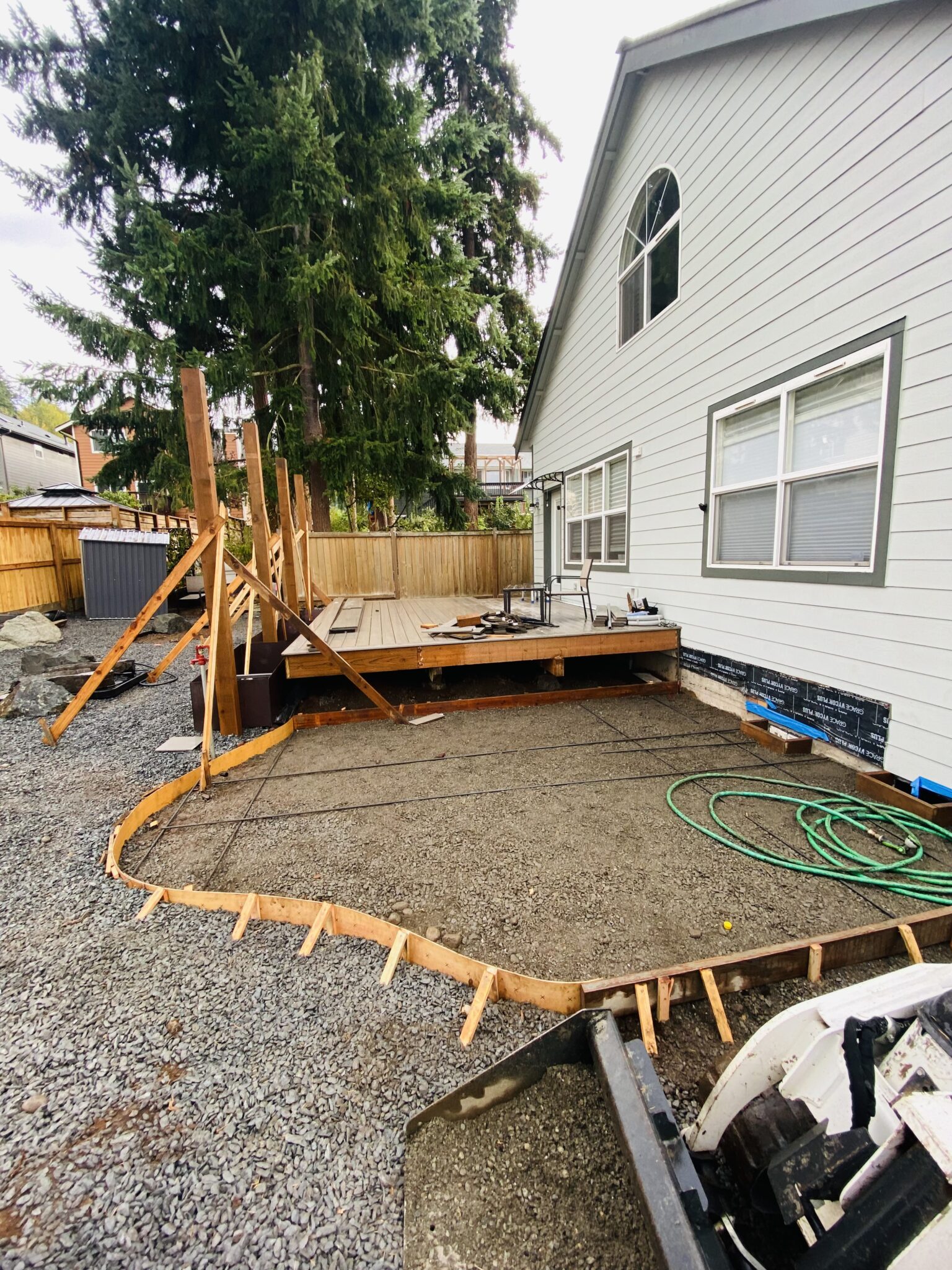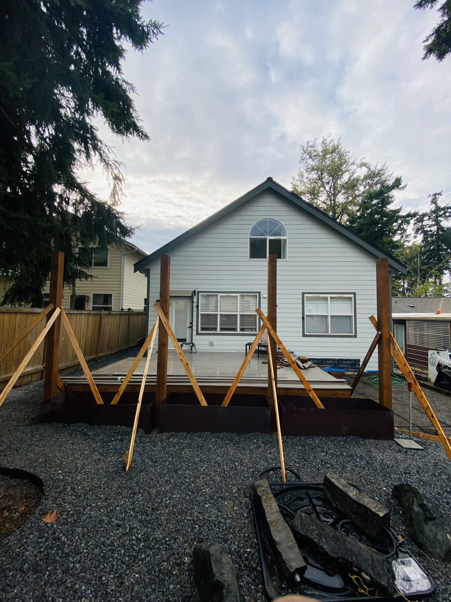 The PCL team removed the existing concrete and wood decking and rebuilt the space with a composite deck featuring modern black railings and built-in lighting. A custom cedar pergola defines the seating area while adding structure and warmth. The surrounding landscape includes a natural stone walkway, decorative gravel beds, and a basalt column water feature for a calm focal point.