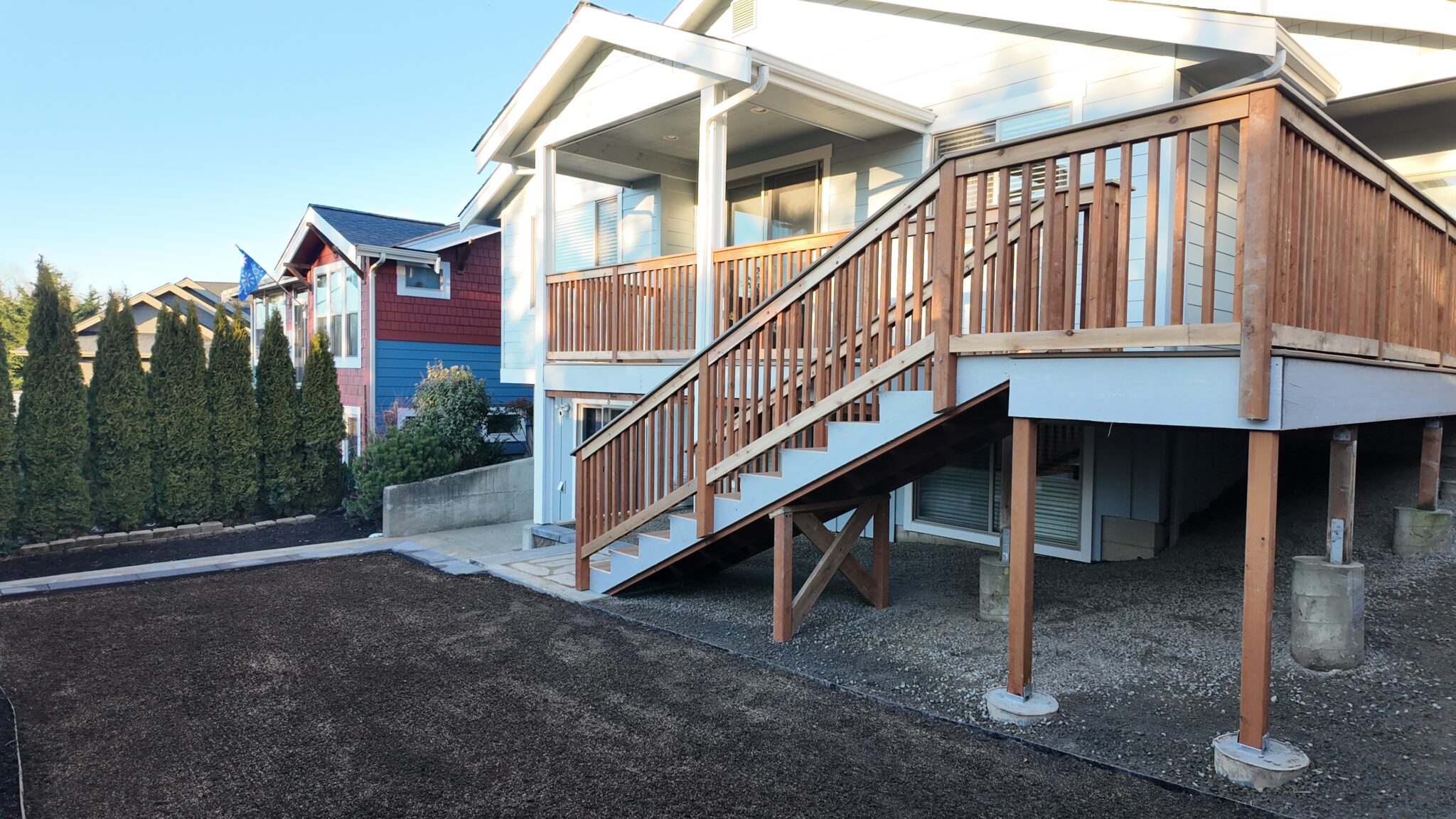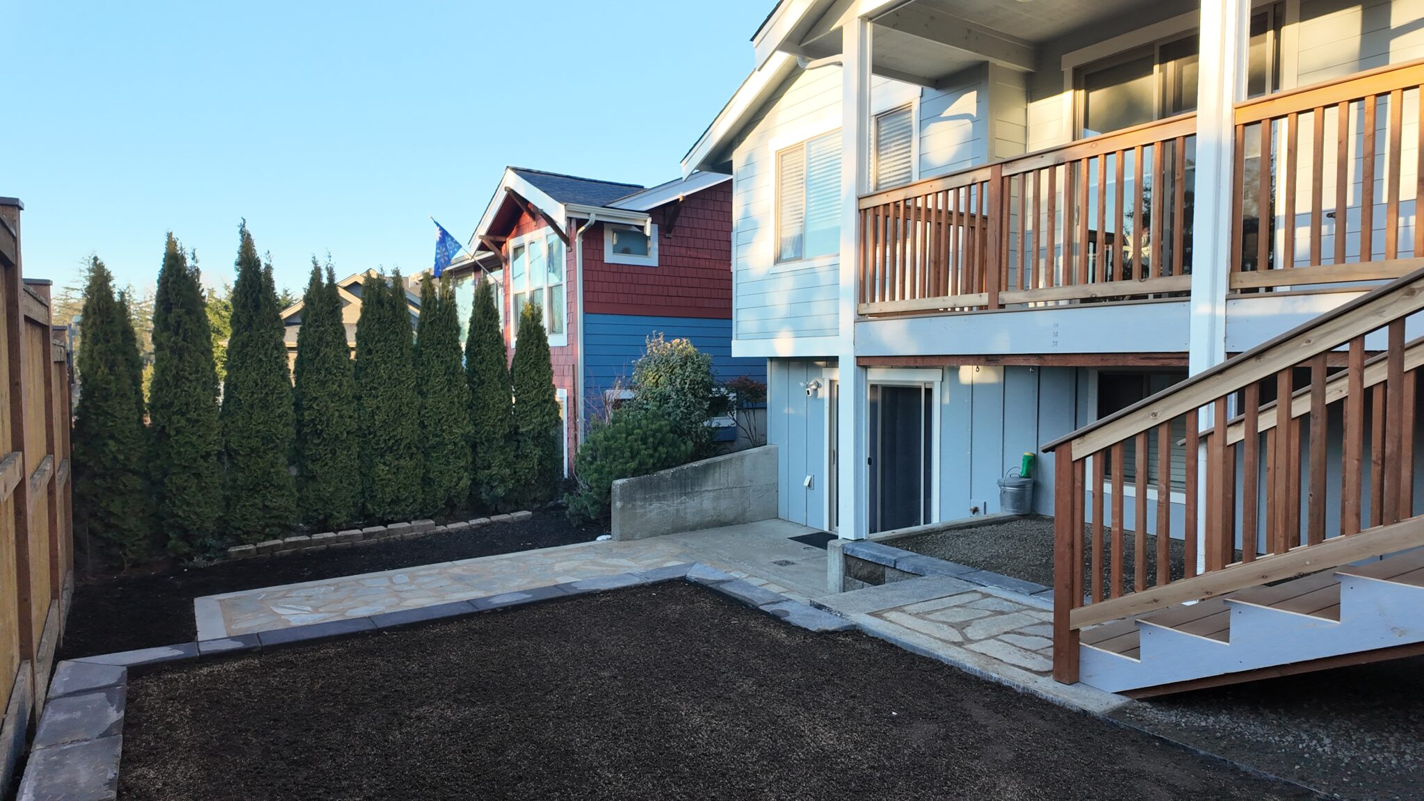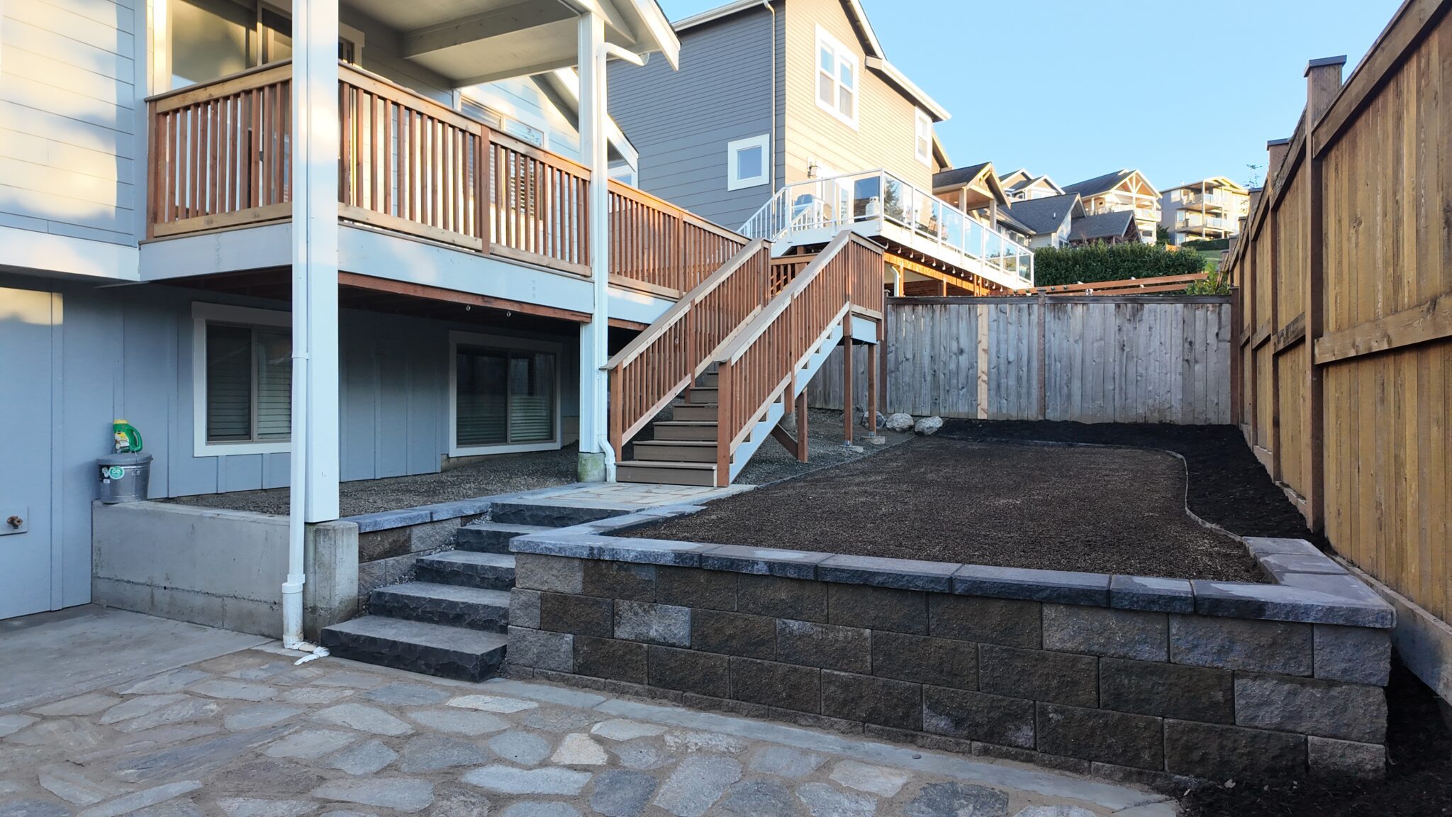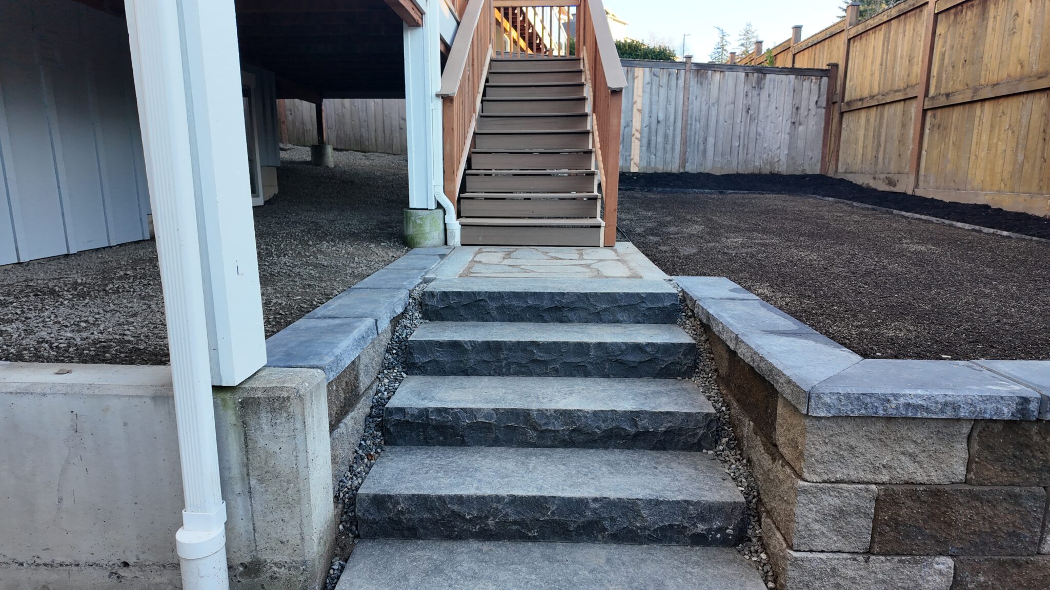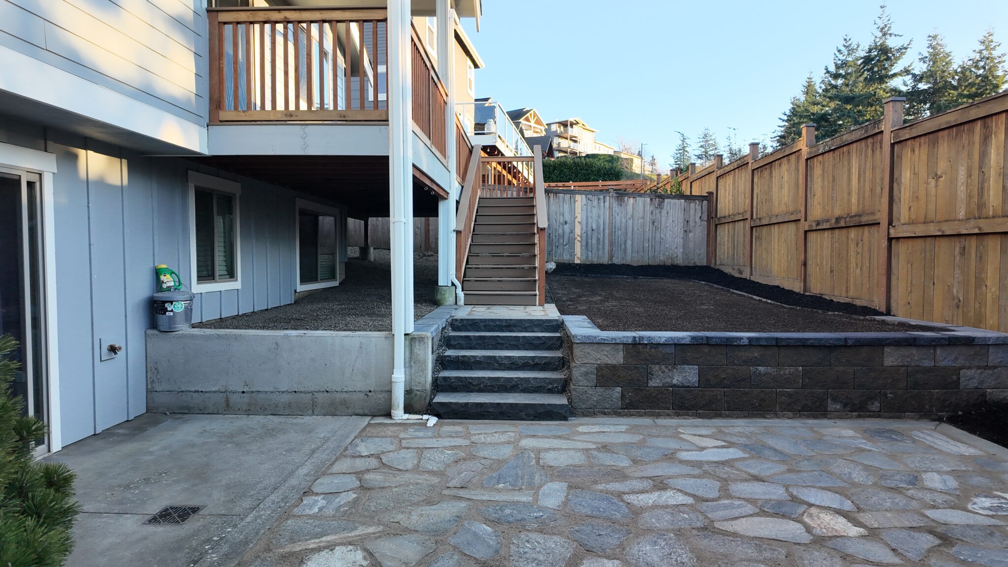 The existing backyard lacked a defined patio area and safe, comfortable access between grade changes. Our team installed a buckskin flagstone patio to create a durable and visually grounded outdoor surface that works well with the home’s architecture. New stone stairs were added to improve circulation between the patio and the upper deck, making the space easier to use day to day.