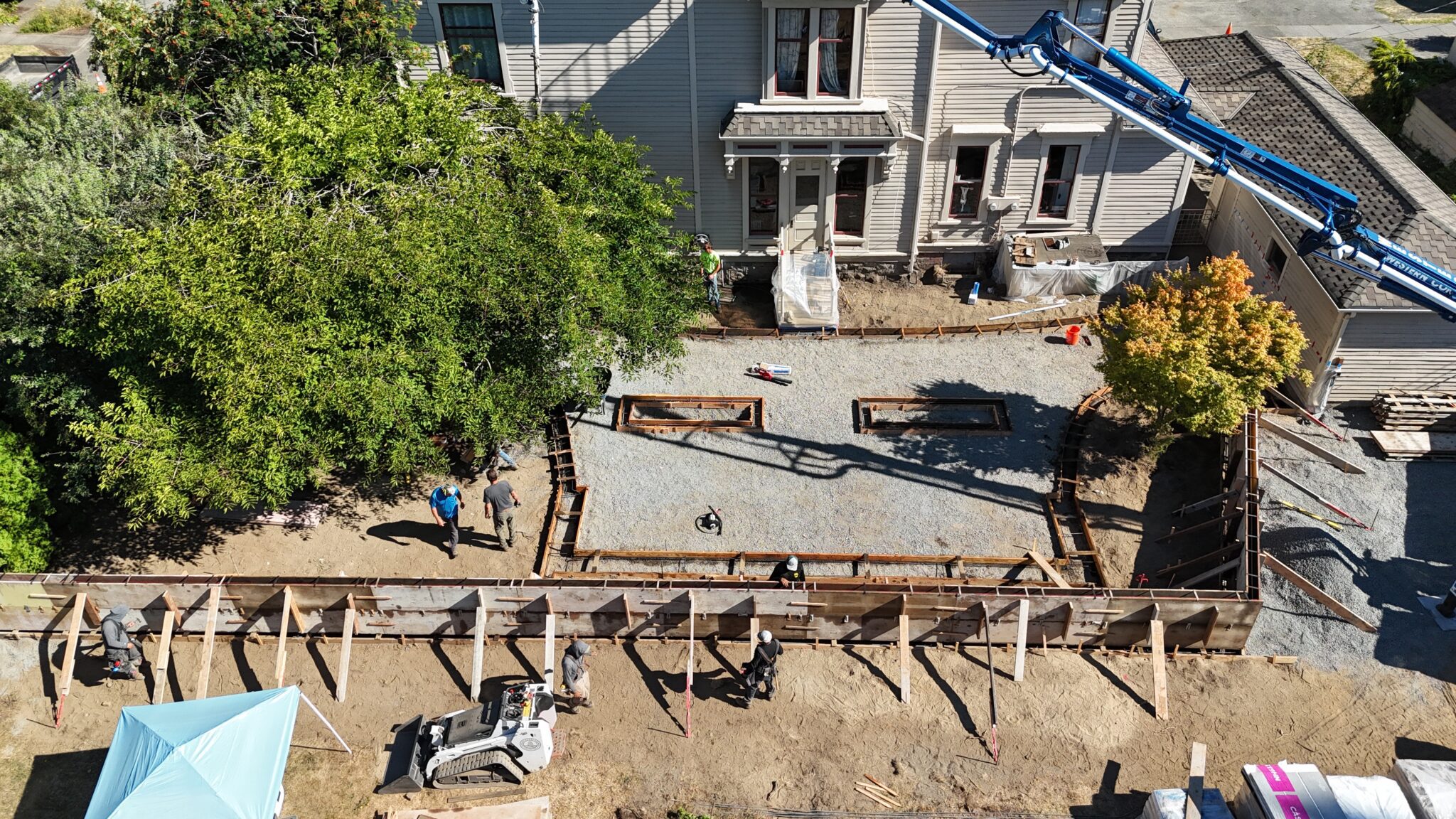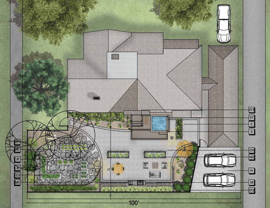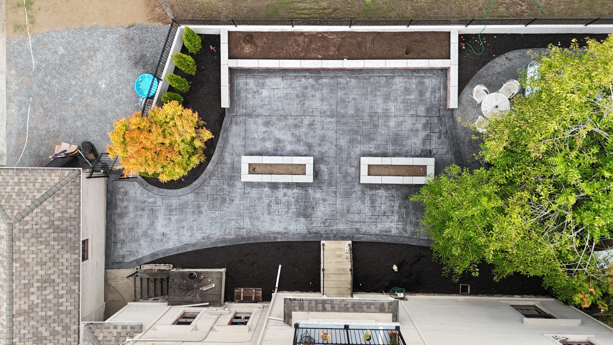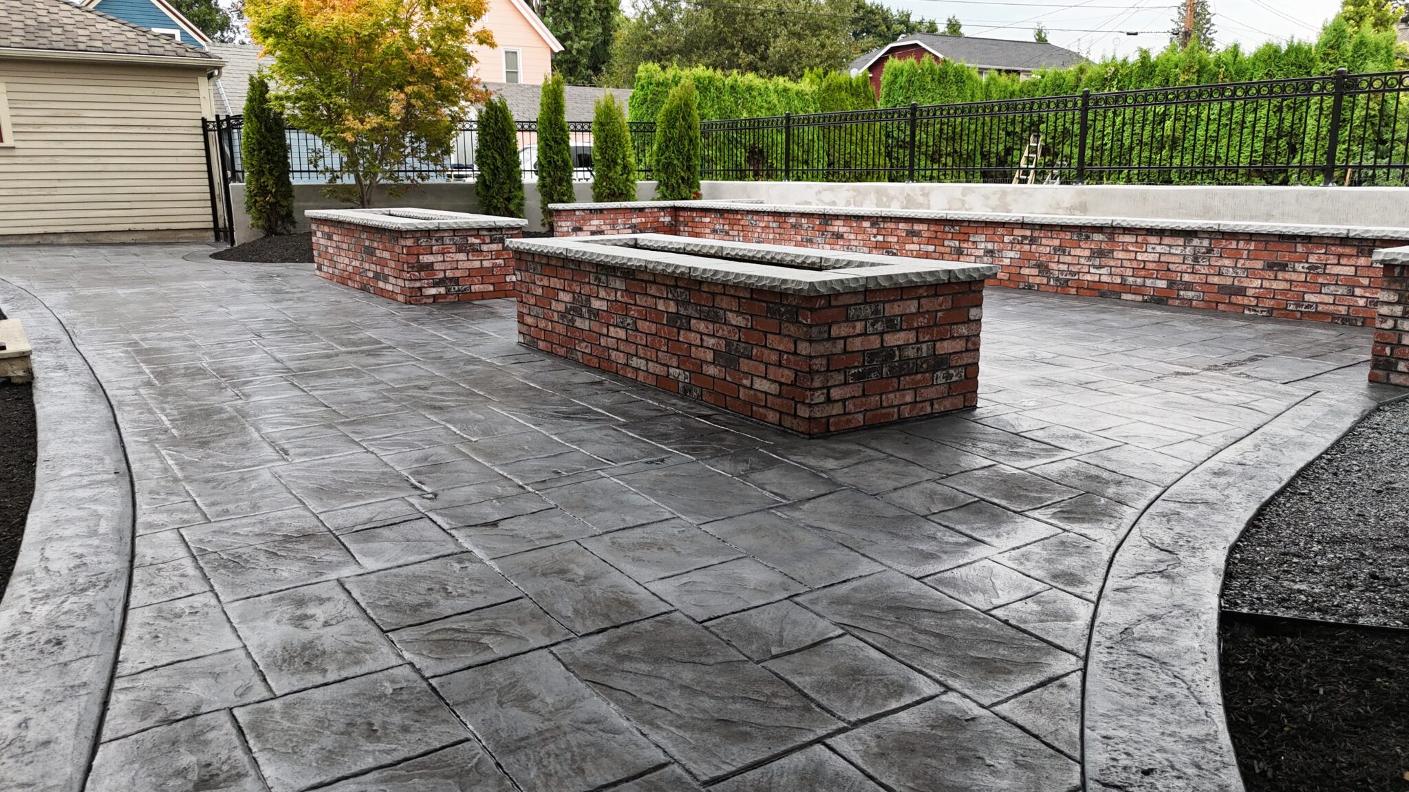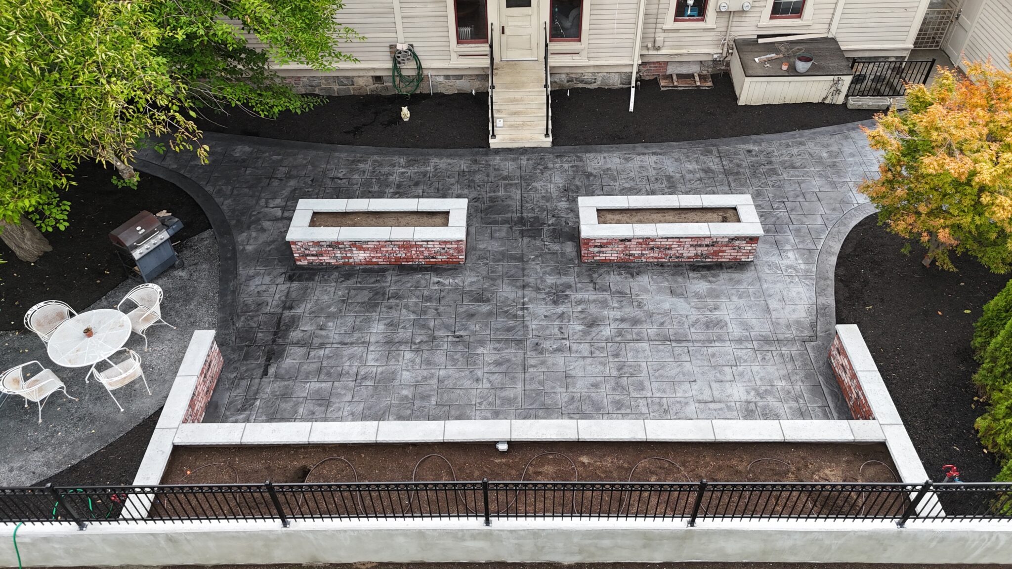 The stamped concrete patio was finished in a slate pattern to add texture and depth while keeping a clean, low-maintenance surface. Raised brick planters with stone caps frame the courtyard, offering room for seasonal planting and extra seating when entertaining. Gentle curves in the layout soften the hardscape and create natural flow between gathering areas. The end result is a timeless courtyard that feels connected to the home’s character while providing the homeowners with a space built for both relaxation and gatherings.