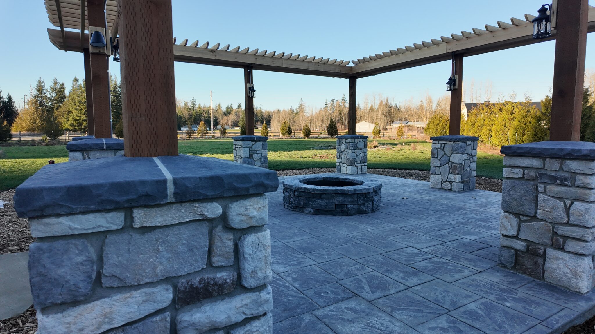Stamped concrete was used to form the main patio surface, providing durability and a clean, consistent base for the space. Pennsylvania bluestone was incorporated as a walkway and as stepping stones surrounding the fire pit, adding texture and visual contrast while defining circulation through the area. Echo Ridge stone veneer was used on the pergola columns to ground the structure and tie it into the surrounding hardscape.