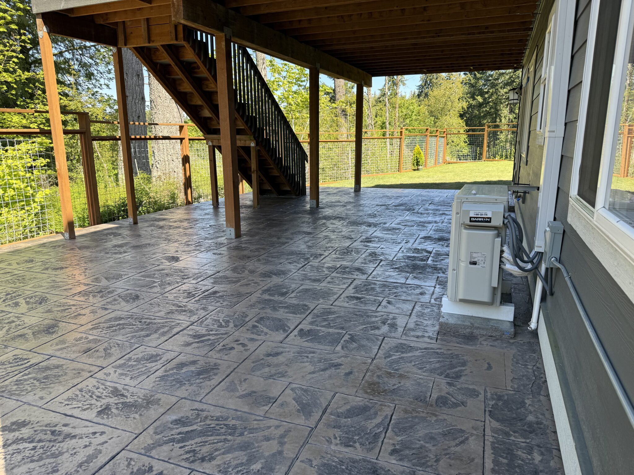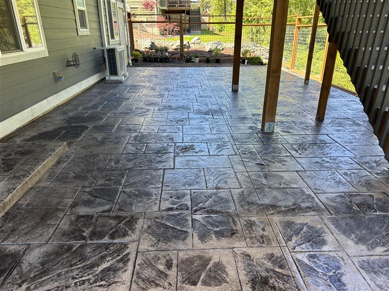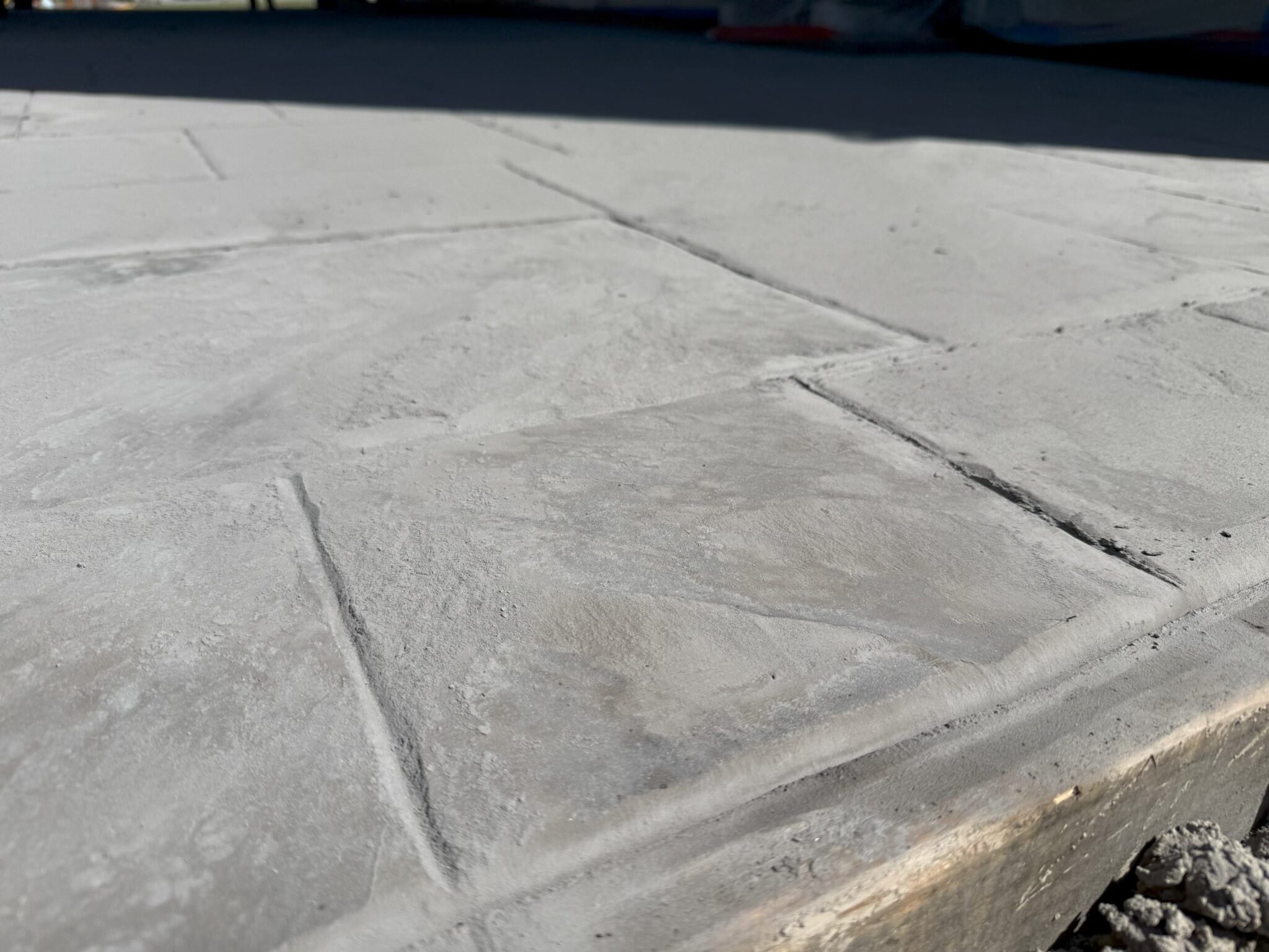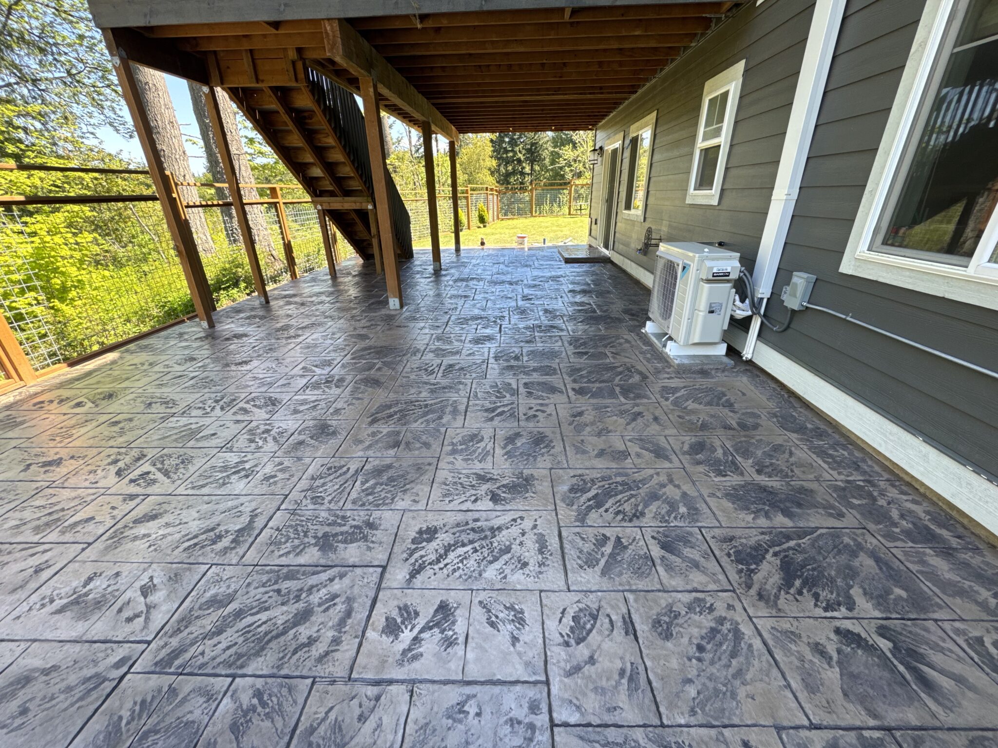 We installed a stamped concrete patio using the Grand Ashlar Slate pattern—one of the most popular choices for clients seeking a natural stone look with clean, geometric lines.
