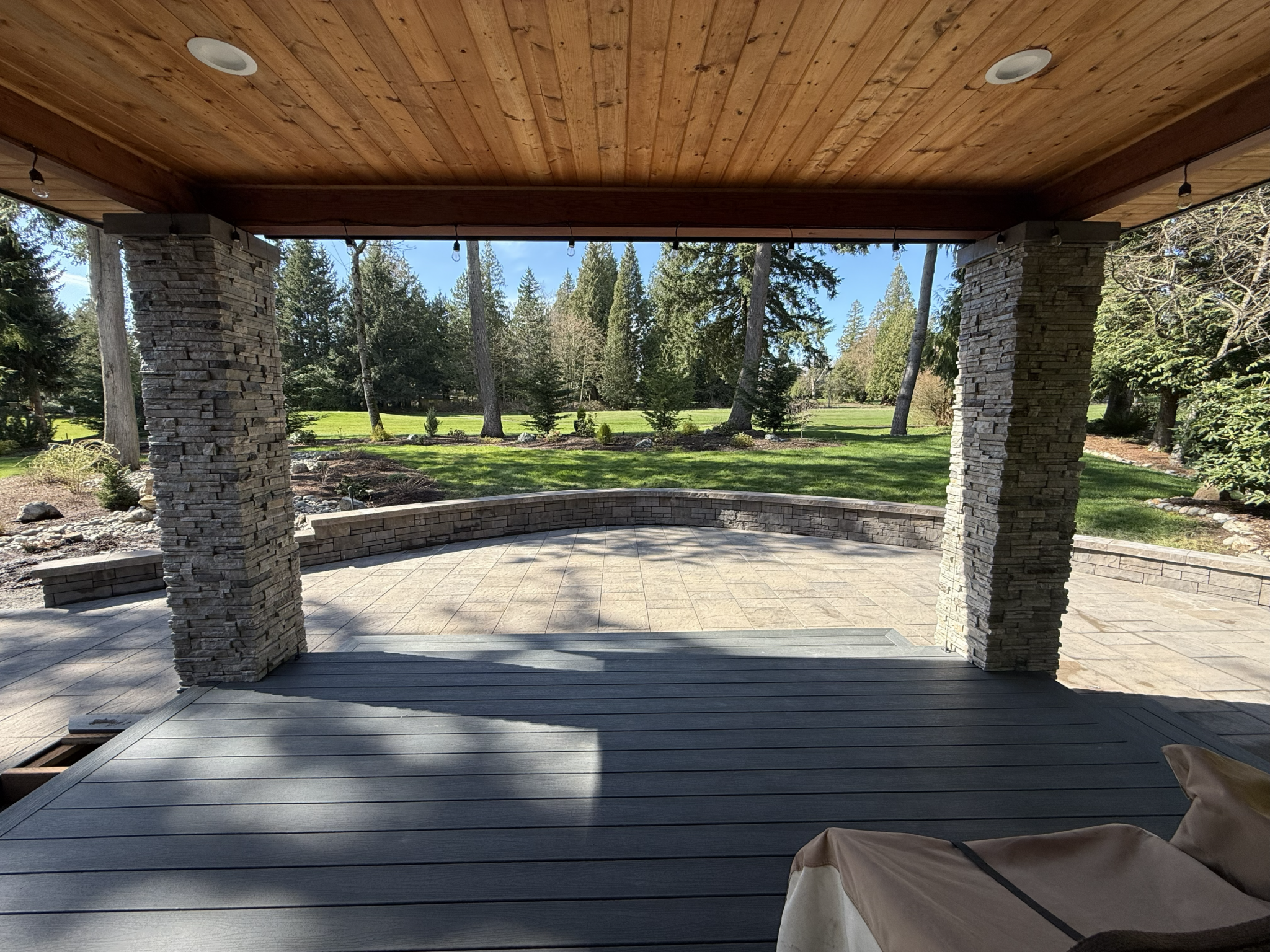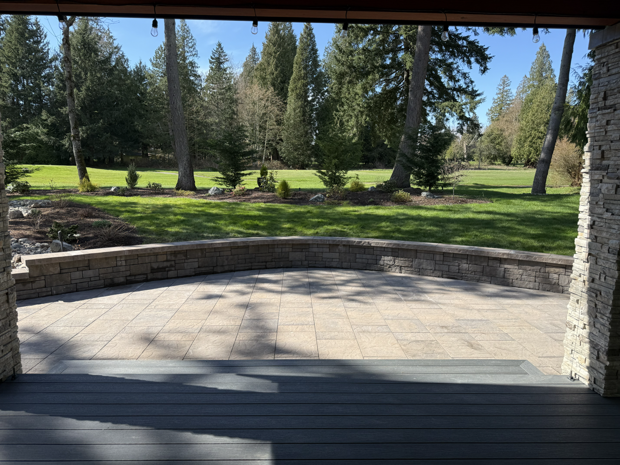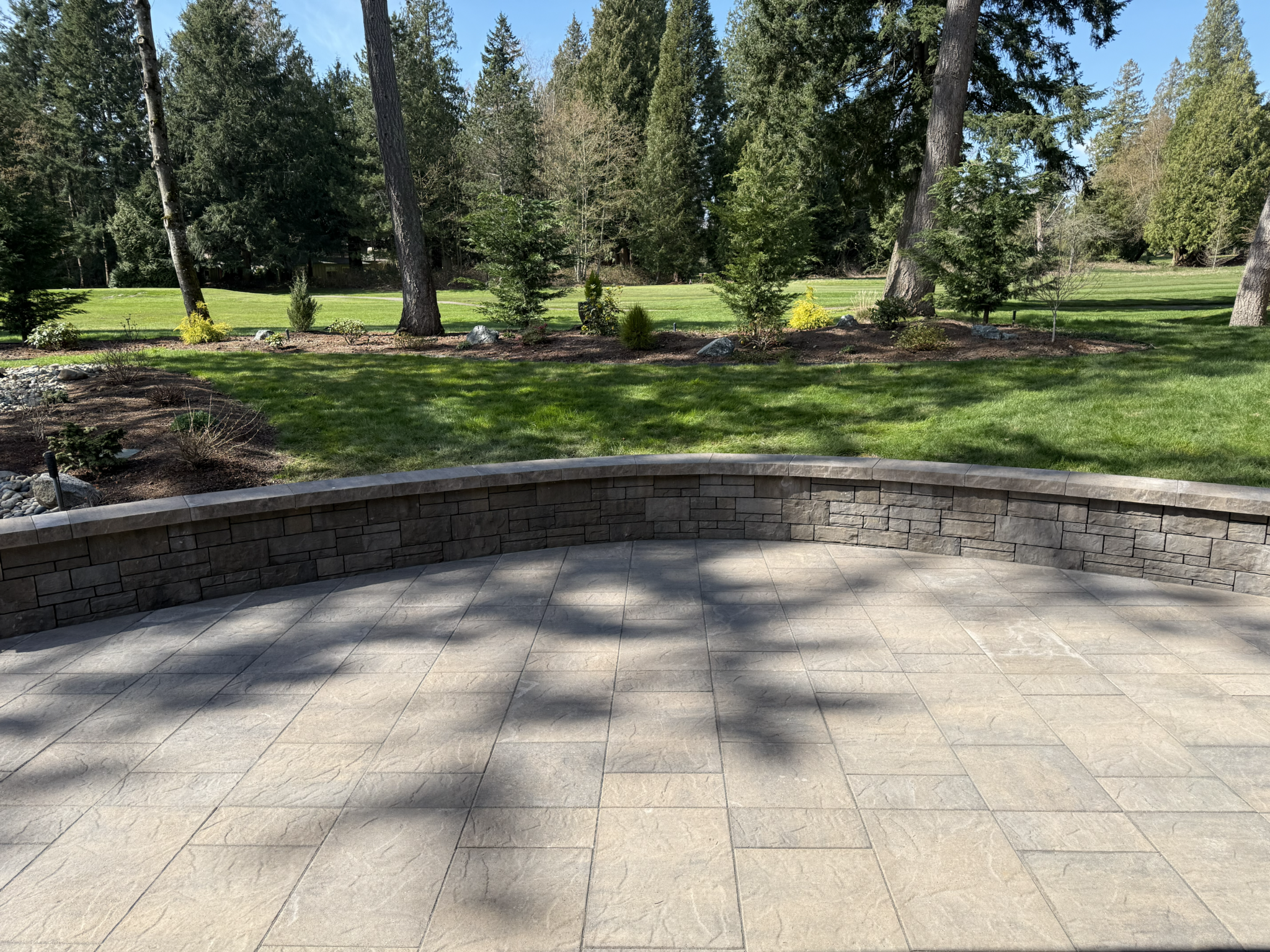 Structural Retaining Wall: Engineered a curved stone retaining wall to level the sloped terrain, providing both structural support and a clean visual anchor for the backyard.