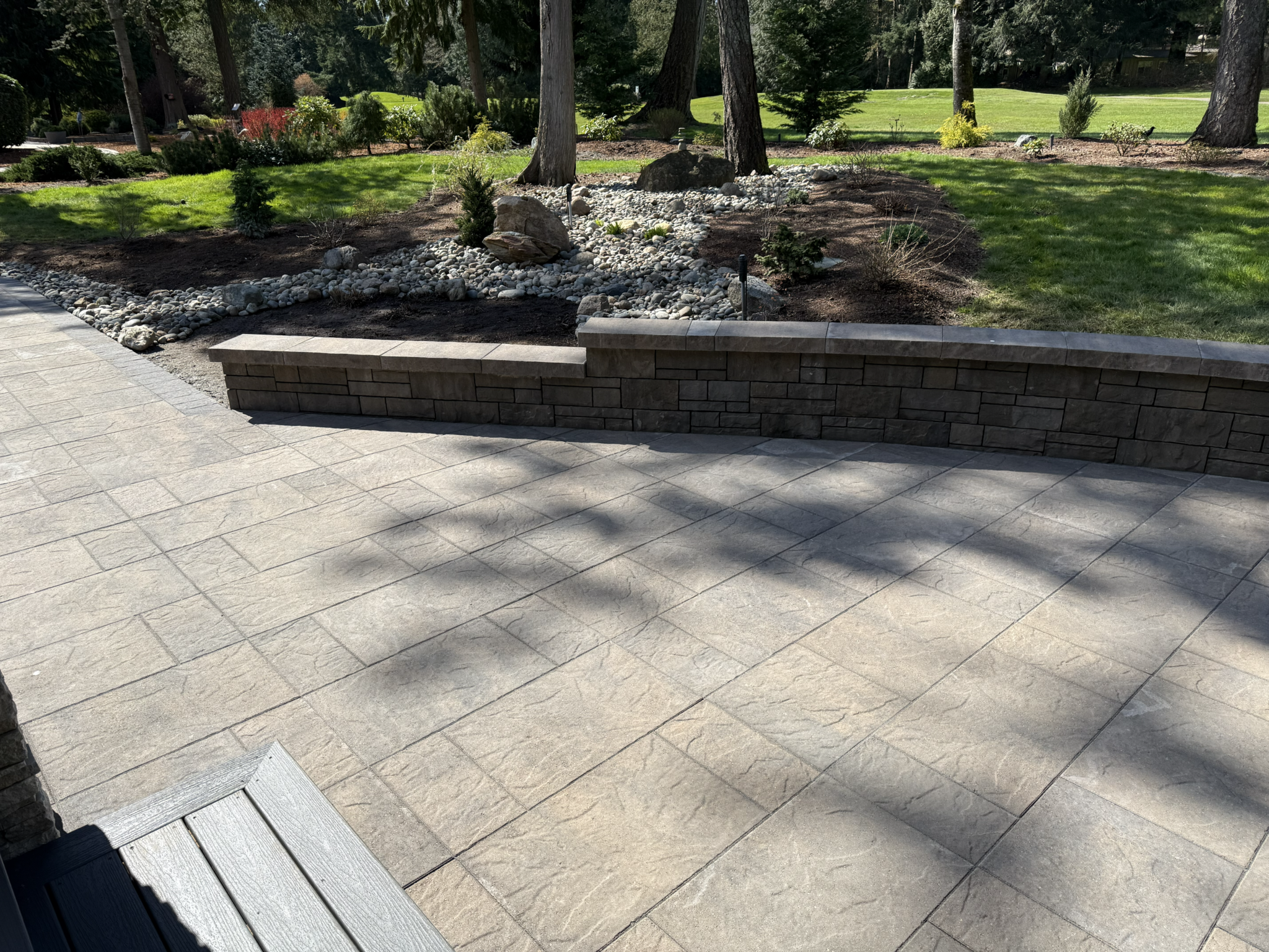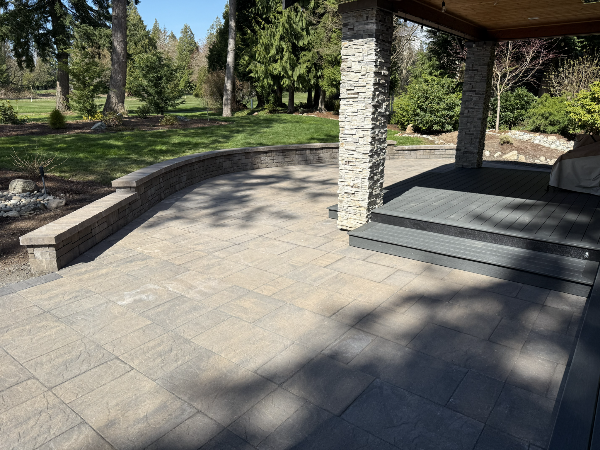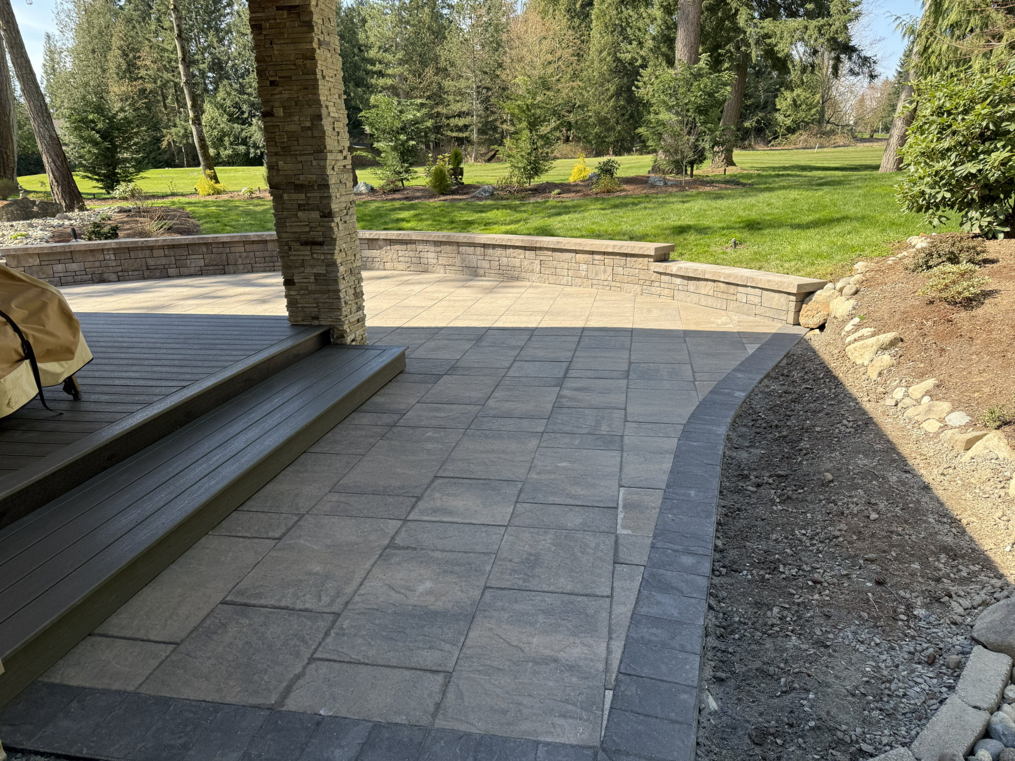Large-Format Pavers: Installed textured, multi-tone pavers with a dark charcoal border, offering a modern aesthetic that complements the home’s stone pillars.