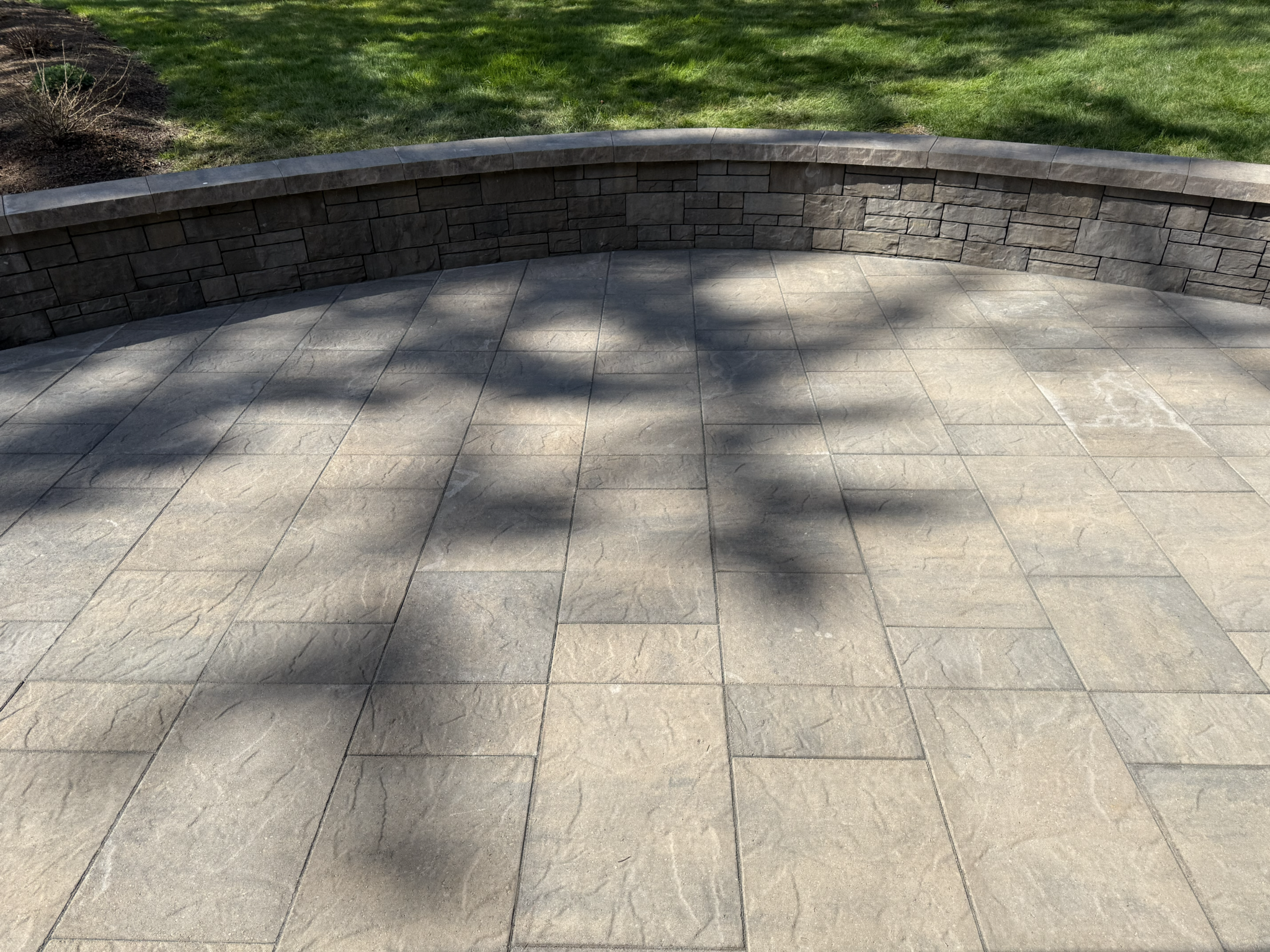 Hardscape Borders: Utilized contrasting dark-toned border pavers to provide a crisp, modern outline that emphasizes the patio’s geometric shape.