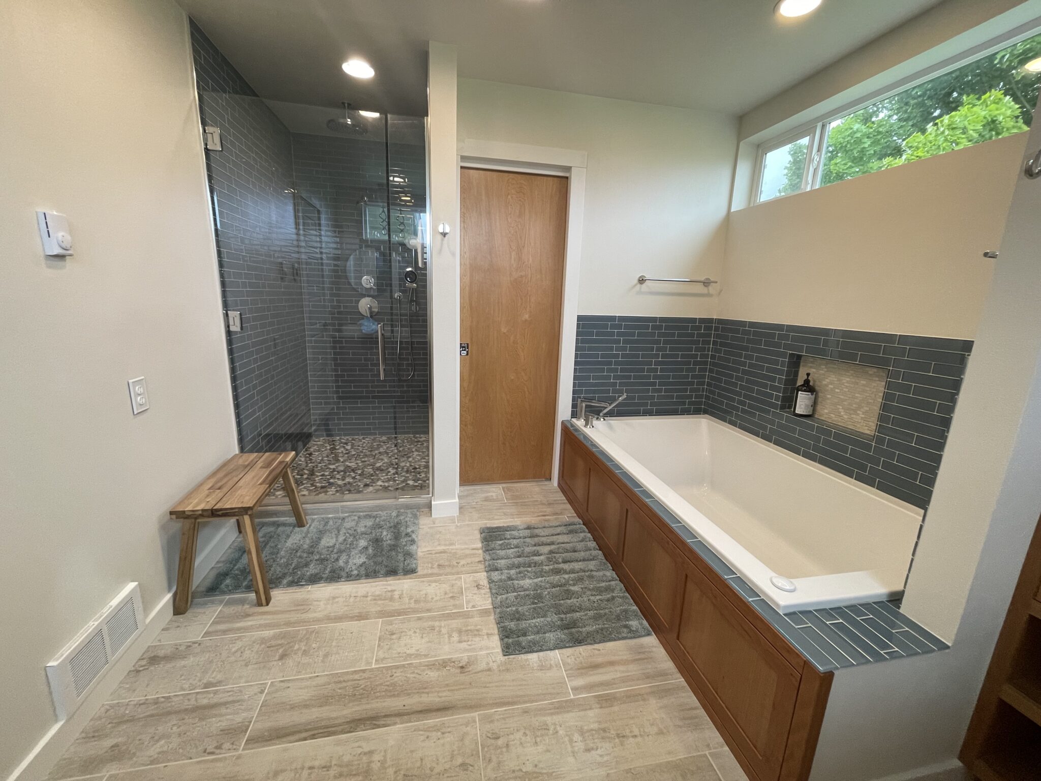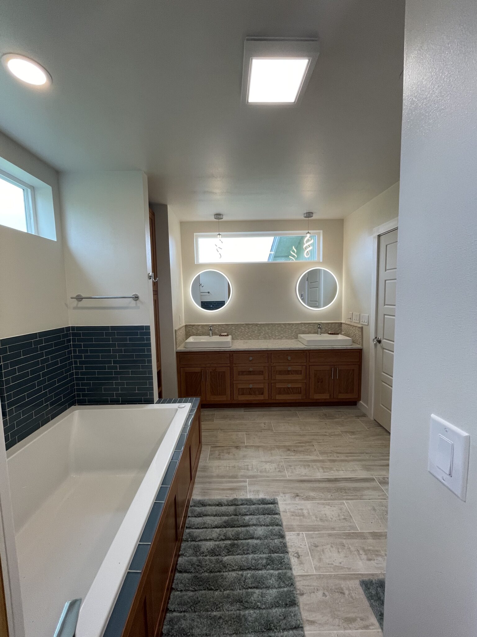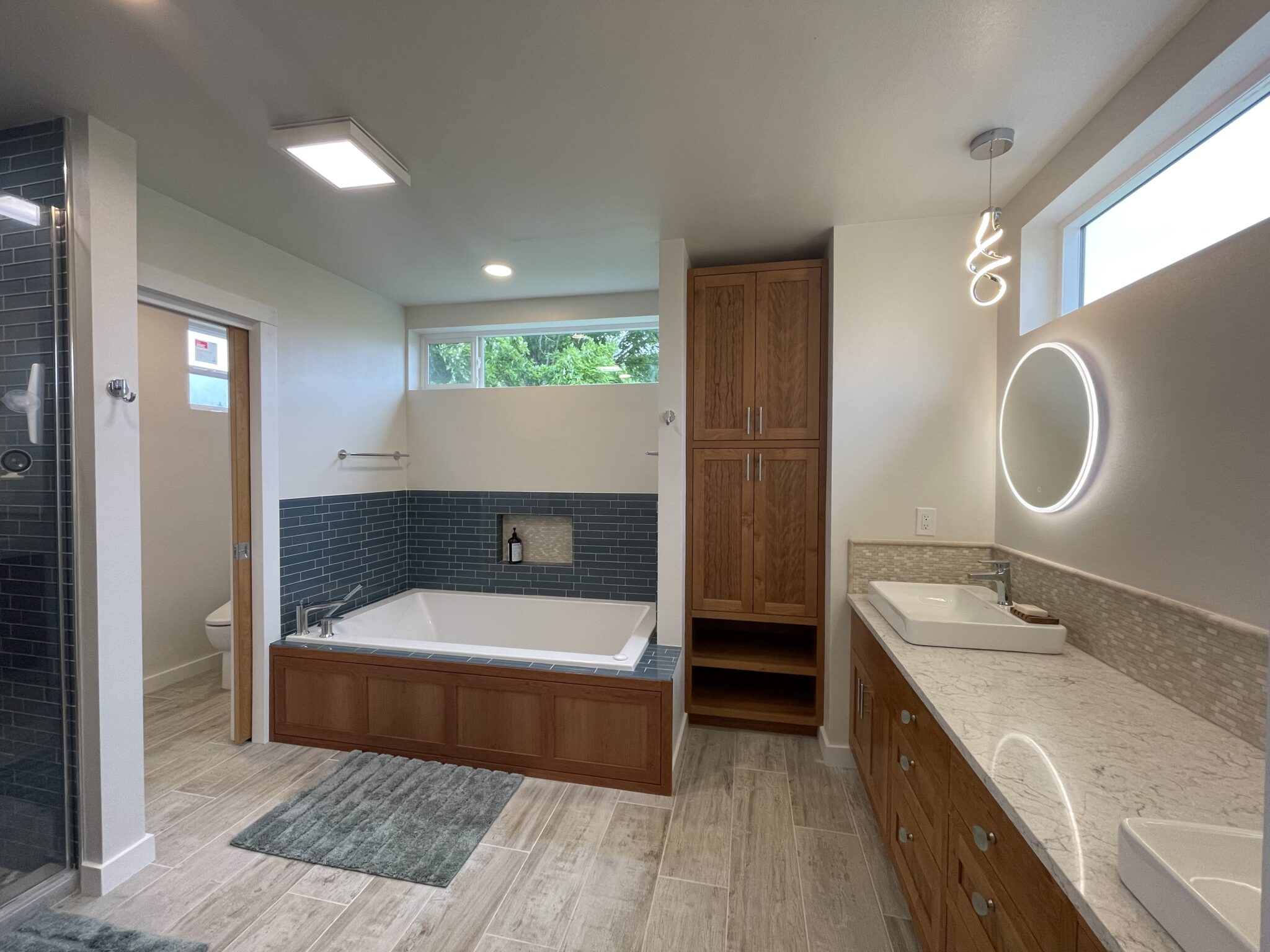 The build began by framing out and enclosing the home’s covered porch, seamlessly tying it into the existing structure. Inside, the design features a large walk-in shower with glass enclosure and pebble flooring, paired with a deep soaking tub finished in rich wood paneling and blue subway tile accents. A double vanity with illuminated mirrors and custom cabinetry offers both function and elegance, while natural light pours in through strategically placed windows. Durable wood-look tile flooring completes the space, blending warmth with easy maintenance. This expansion not only delivered a beautiful, spa-like bathroom but also added long-term value to the home.
