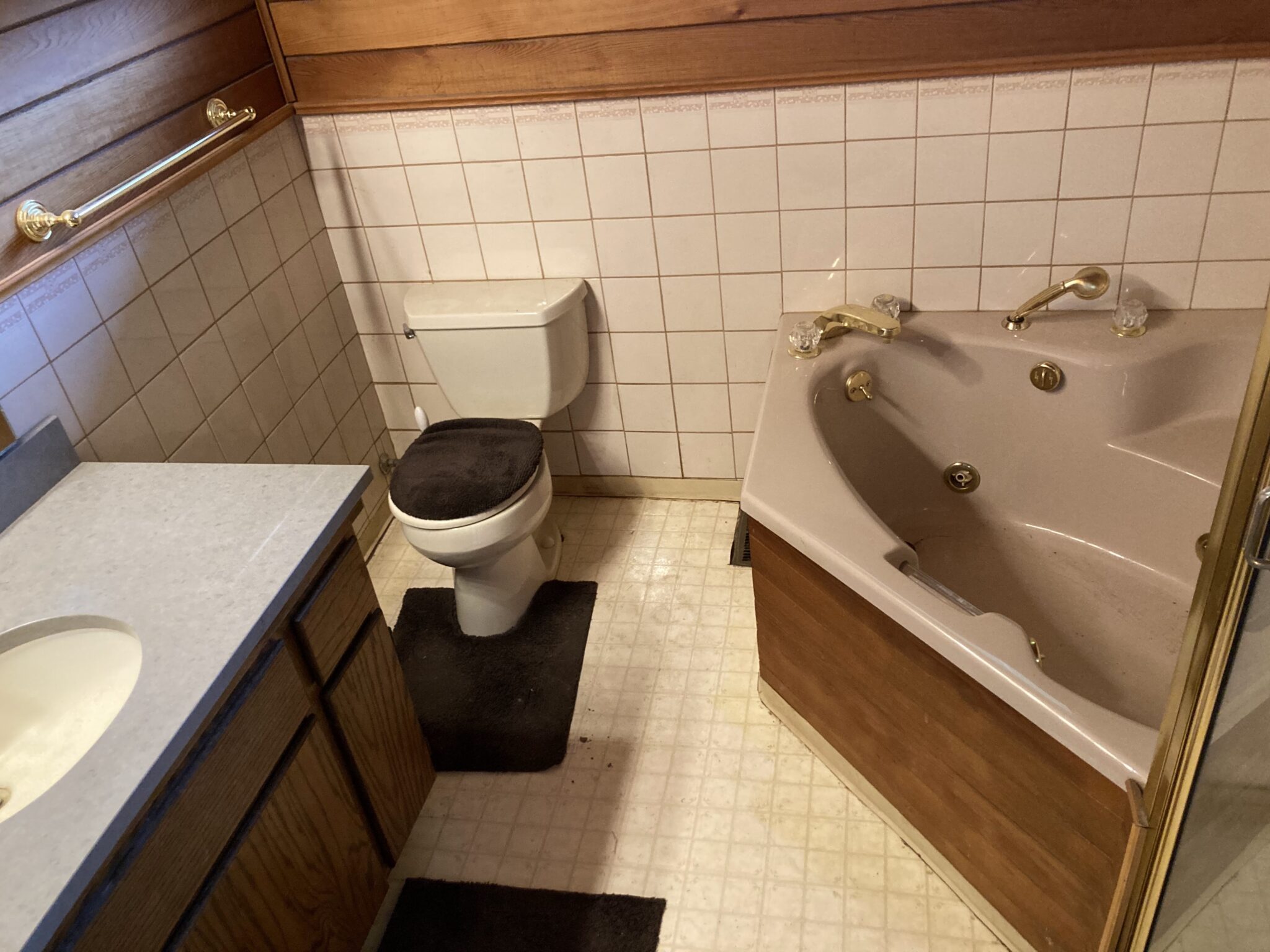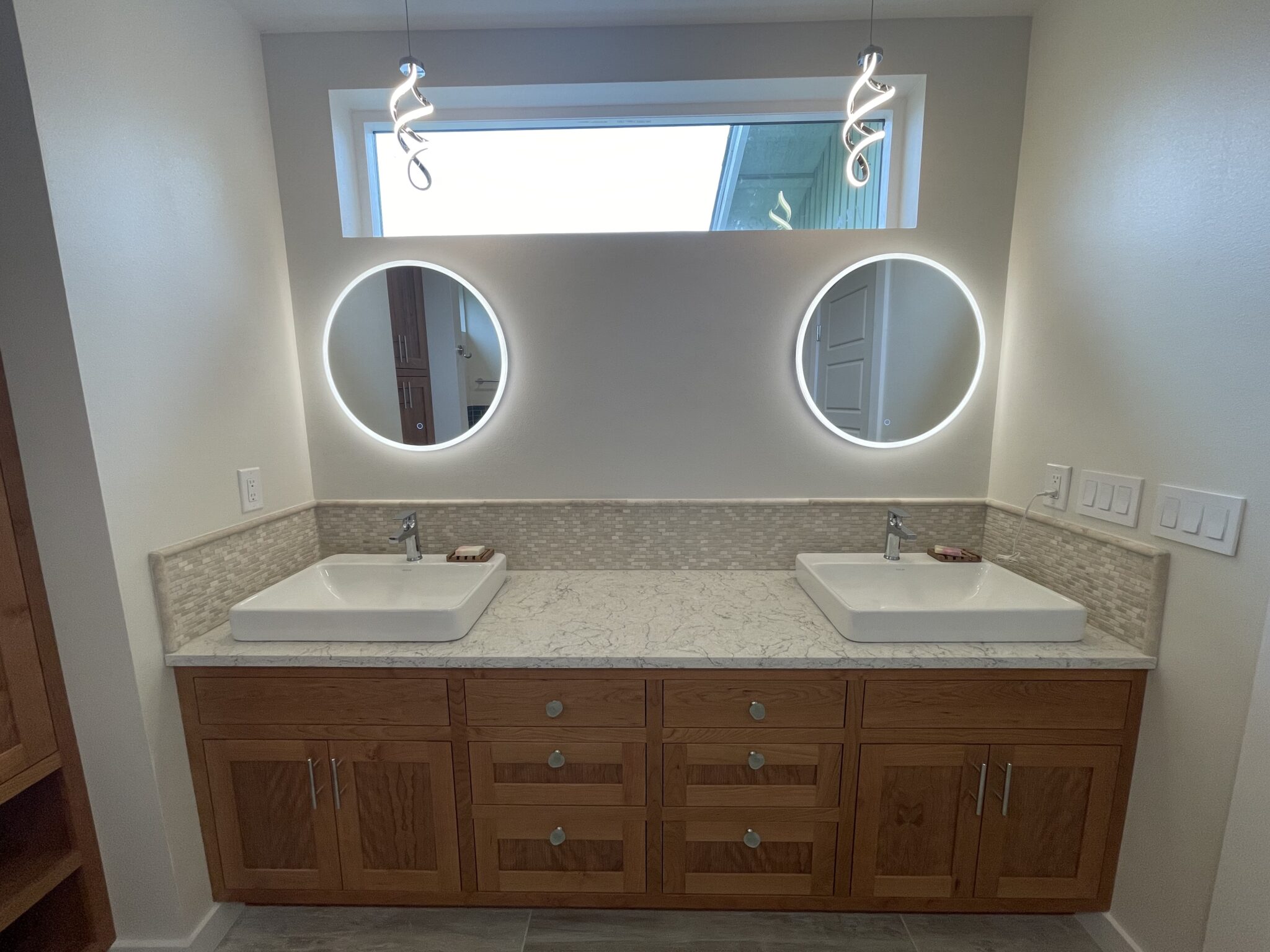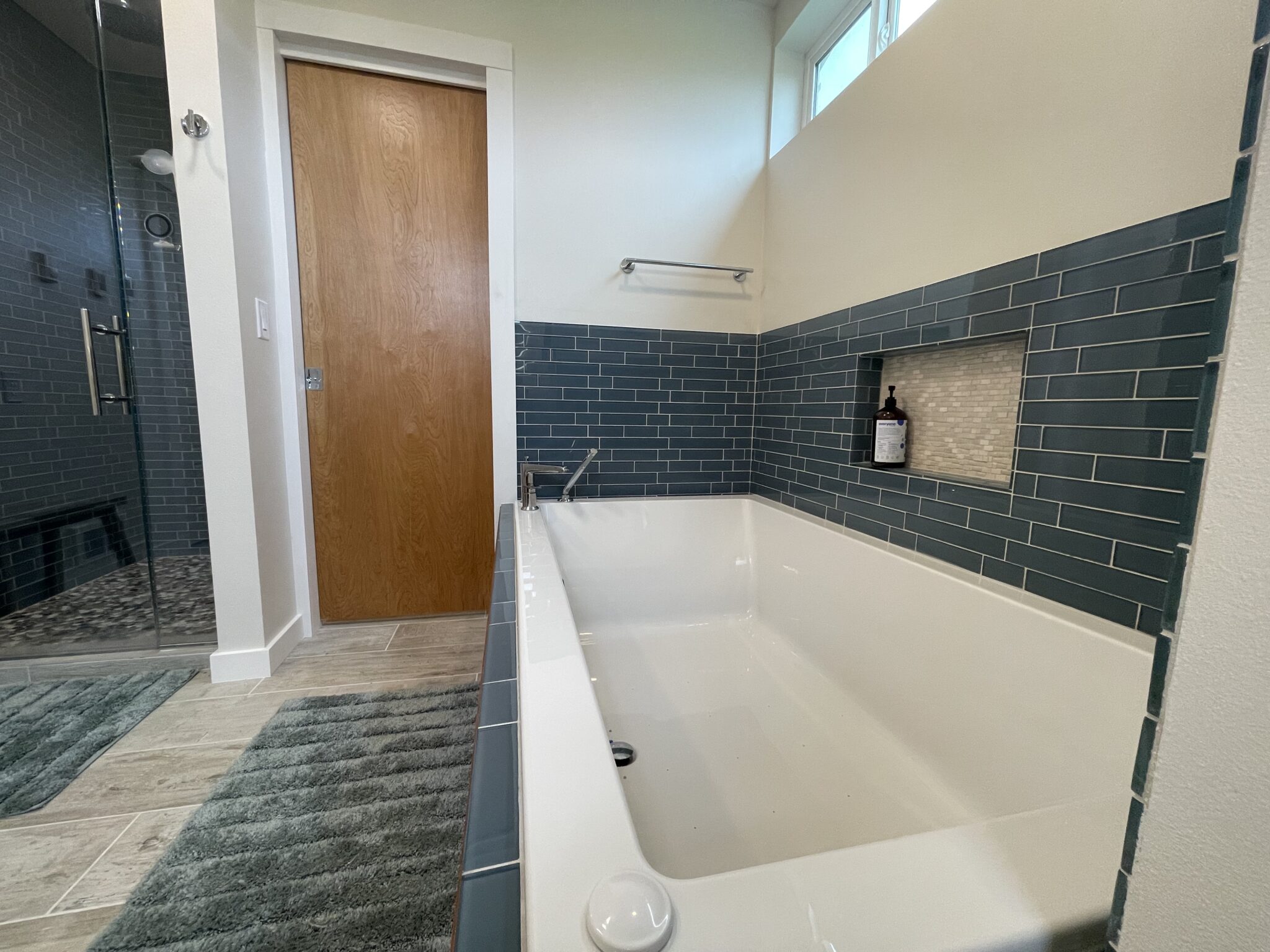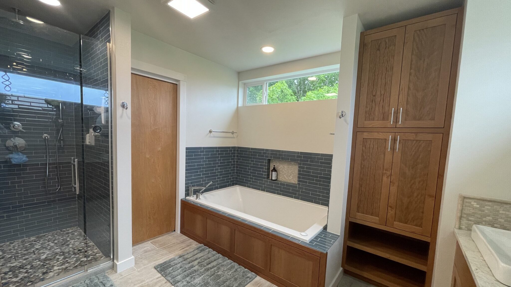 The build began by framing out and enclosing the home’s covered porch, seamlessly tying it into the existing structure. Inside, the design features a large walk-in shower with glass enclosure and pebble flooring, paired with a deep soaking tub finished in rich wood paneling and blue subway tile accents. A double vanity with illuminated mirrors and custom cabinetry offers both function and elegance, while natural light pours in through strategically placed windows. Durable wood-look tile flooring completes the space, blending warmth with easy maintenance. This expansion not only delivered a beautiful, spa-like bathroom but also added long-term value to the home.
